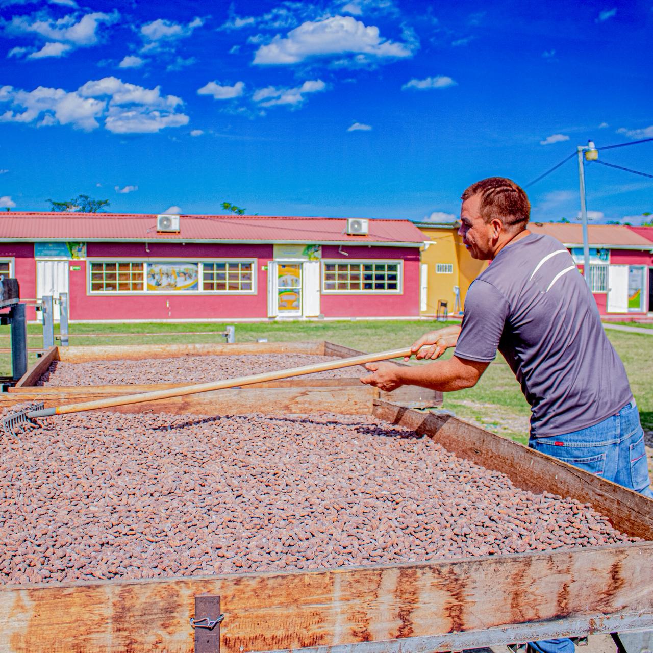 Secamos nuestro cacao principalmente al sol en marquesinas, complementando con secado artificial en días de alta humedad para preservar la calidad y evitar moho.
