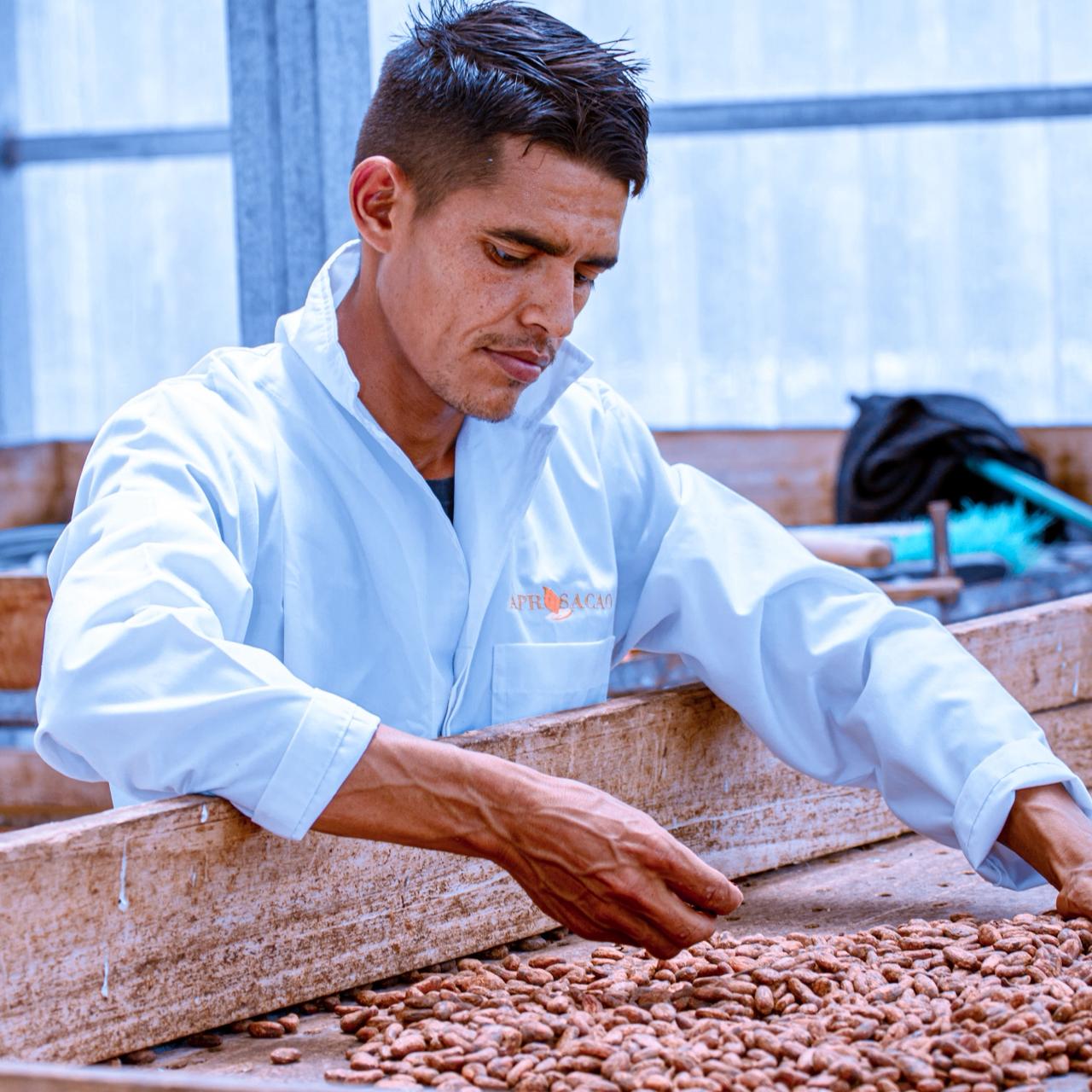 En APROSACAO procesamos el cacao desde la finca hasta convertirlo en un grano seco de alta calidad. Nuestro proceso combina prácticas orgánicas, fermentación controlada y secado al sol, garantizando aroma, sabor y trazabilidad en cada lote.